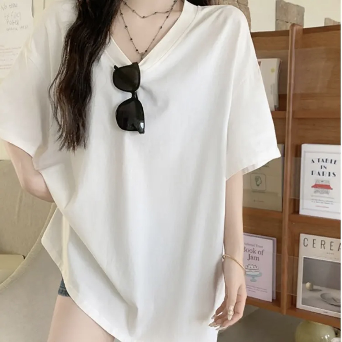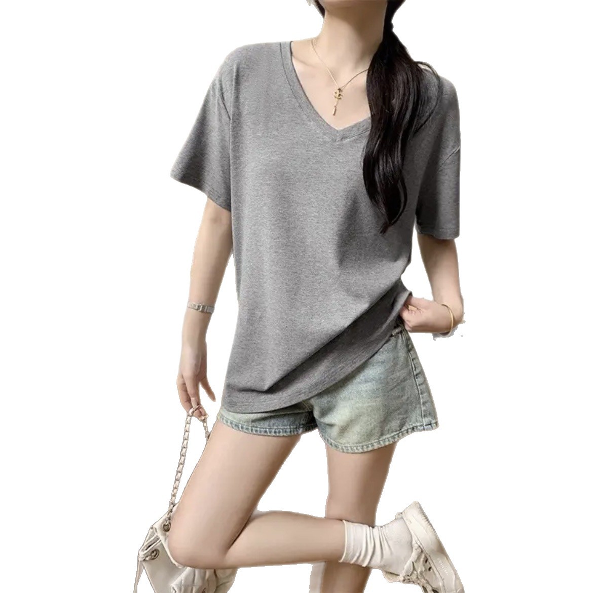Oversized V-Neck Loose Solid Color Short-Sleeved Shirt